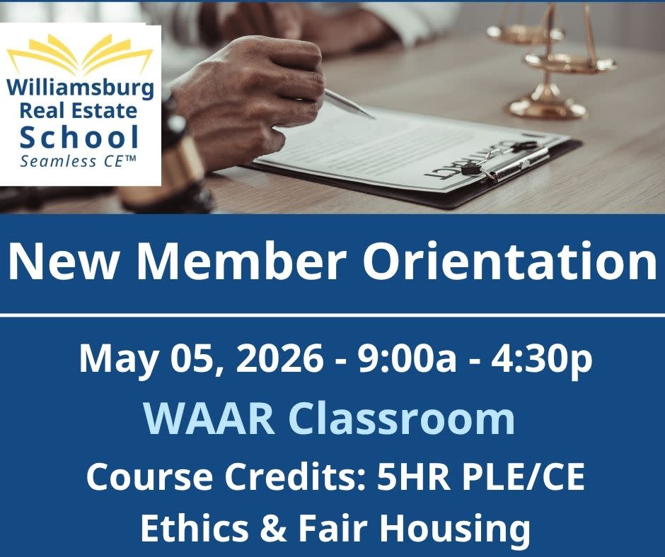Welcome to the Williamsburg Area Association of REALTOR®. We’re excited to have you join us for New Member Orientation.