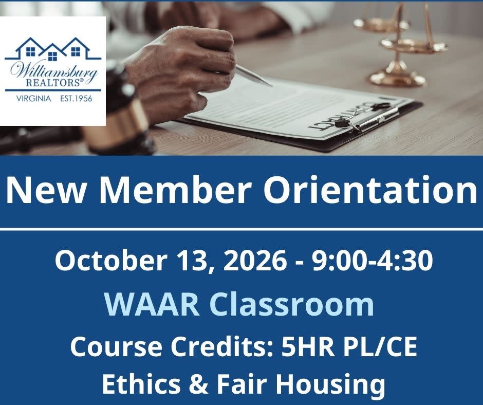 Welcome to the Williamsburg Area Association of REALTOR®. We’re excited to have you join us for New Member Orientation.
